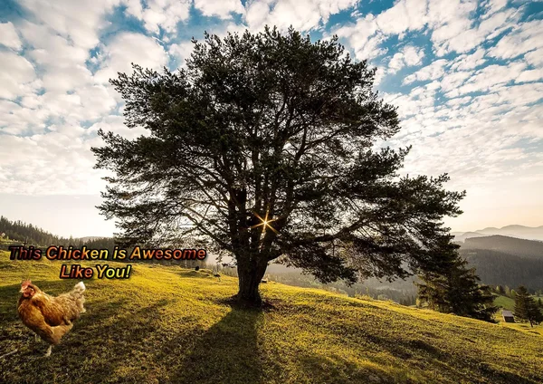 Für die Bildkomposition habe ich in Affinity Studio zunächst eine Wiese als Hintergrund angelegt und darauf ein freigestelltes Huhn platziert. Anschließend habe ich den Text “This Chicken is Awesome - Like You!” hinter dem Huhn positioniert, sodass eine klare Tiefenwirkung entsteht.