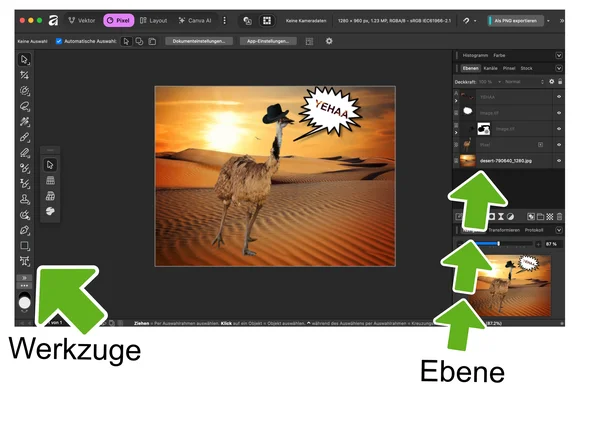 Mit Affinity Photo kann man Bilder professionell bearbeiten und kreativ gestalten. Das Programm bietet viele ähnliche Werkzeuge wie Photoshop, zum Beispiel zum Freistellen, Retuschieren oder Arbeiten mit Ebenen. Besonders praktisch sind die übersichtliche Benutzeroberfläche und die einmalige Kaufoption ohne Abo. Affinity eignet sich gut für Fotomontagen, Grafikdesign und kreative Projekte.
