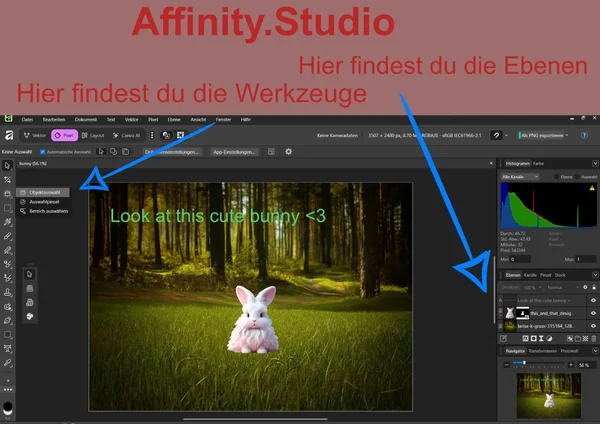In der Mitte sieht man die Arbeitsfläche mit einem Beispielbild: Ein süßes weißes Häschen sitzt auf einer grünen Wiese im Wald. Darüber steht der Text „Look at this cute bunny <3“. Dieses Beispiel zeigt, wie man Bilder und Texte in Affinity Studio kombinieren und gestalten kann.