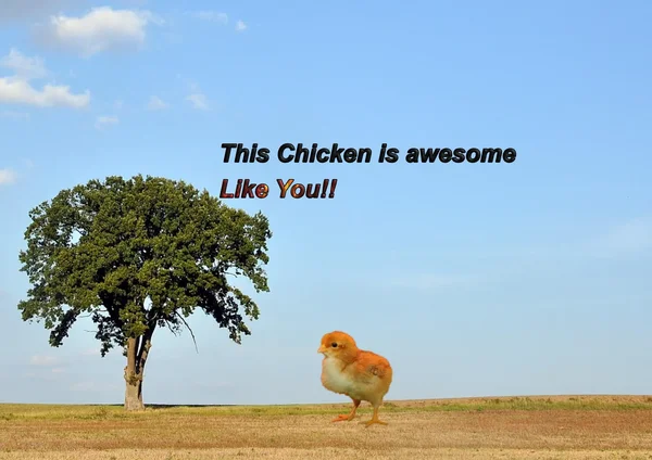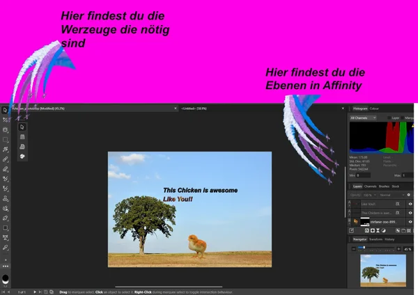 Für meine Bildgestaltung habe ich in Affinity zunächst eine Landschaft als Hintergrund eingefügt und dann das Hühnchen. Anschließend habe ich den Text ergänzt und ein Bild darüber gelegt das der Schriftzug wie Lava aussieht.