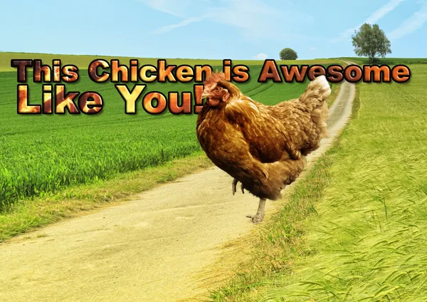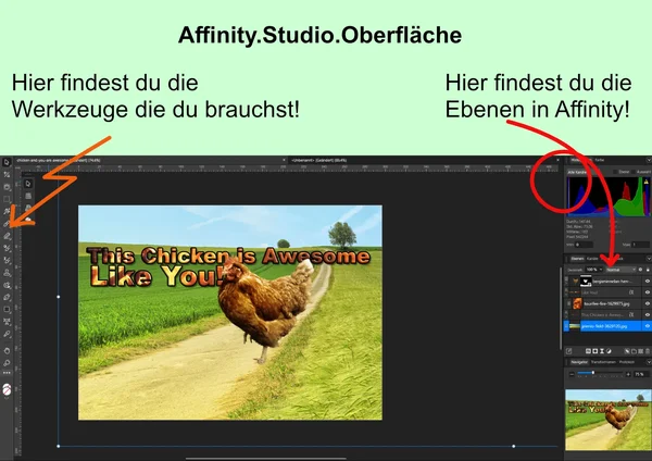 Für die Bildkomposition habe ich in Affinity Studio zunächst eine Wiese als Hintergrund angelegt und darauf ein freigestelltes Huhn platziert. Anschließend habe ich den Text „This Chicken is Awesome – Like You!“ hinter dem Huhn positioniert, sodass eine klare Tiefenwirkung entsteht.